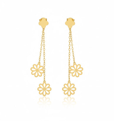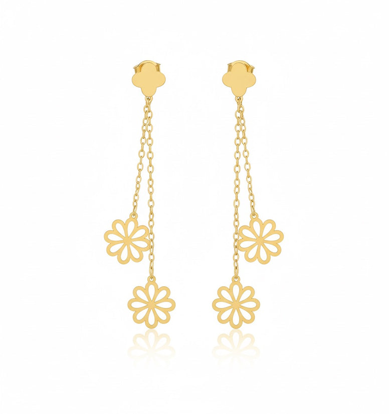 Each earring showcases a polished clover-shaped stud from which two fine chains descend, ending in softly curved open-flower charms. The dual-chain movement creates a gentle shimmer with every turn of the head, echoing the lightness and rhythm of nature.