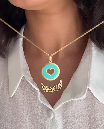 The 18K Gold Heart Necklace, measuring 40 cm, features Meena turquoise accents, adding a treasured touch to your collection.