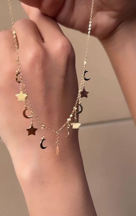 The 18k Gold Moon & Star Necklace offers a stylish and uplifting design that complements any jewelry collection.