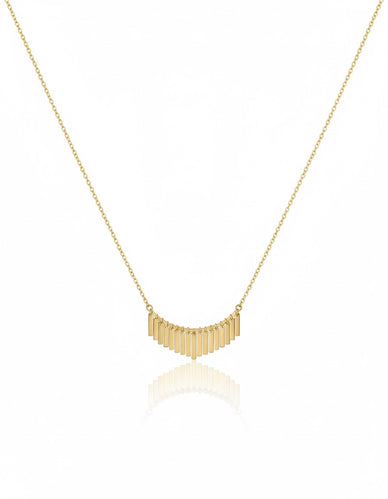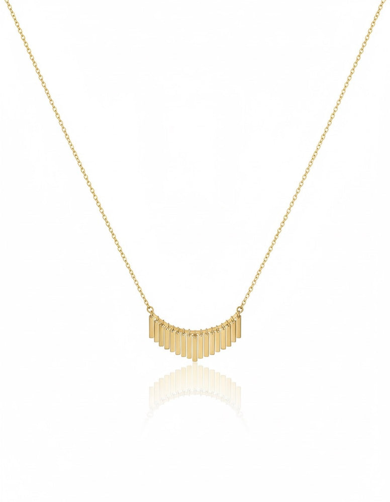 This set includes a graceful necklace adorned with vertical gold bars and matching earrings that combine bold minimalism with everyday wearability.