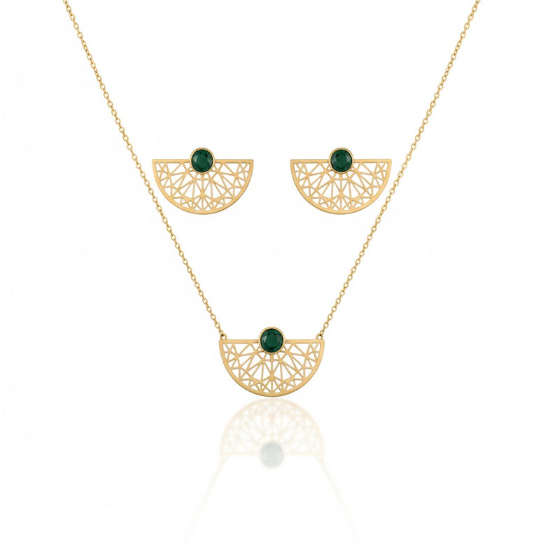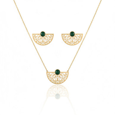 Elevate your style with the exquisite beauty of our 18K Gold Malachite Set, a masterpiece of craftsmanship and design. This elegant set includes a finely crafted necklace and matching earrings, each showcasing a vivid green malachite gemstone — known for its unique natural patterns and deep, mesmerizing color.